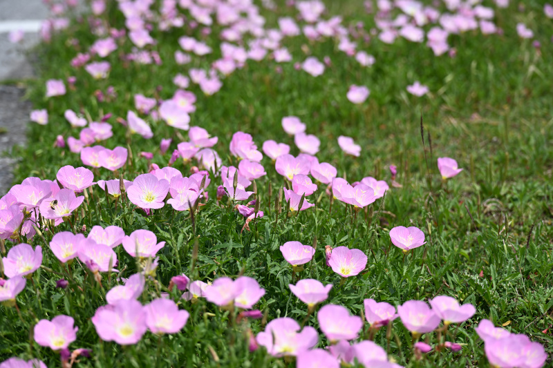 残波岬公園に車を停めると、駐車場の周りには淡いピンクのヒルザキツキミソウが綺麗に咲いていました。